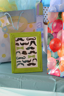 Another simple, yet perfectly placed decoration...I took a few frames from the Dollar Tree and painted them in different colors of greens and blues to match the shower. I then created mustache and bow tie prints on my computer to place inside the painted frames and put along the food and gift tables. Simply...perfect!